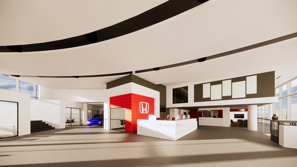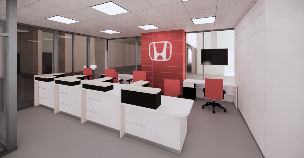 Some of the features worth mentioning include: a new “H” sign which will illuminate at night, giving our main showroom area a sleek presence at night; several “Honda red” feature walls which evoke professionalism and playfulness, LED lighting, new screens which will display our inventory, sales specials and guest appointment welcome messages.